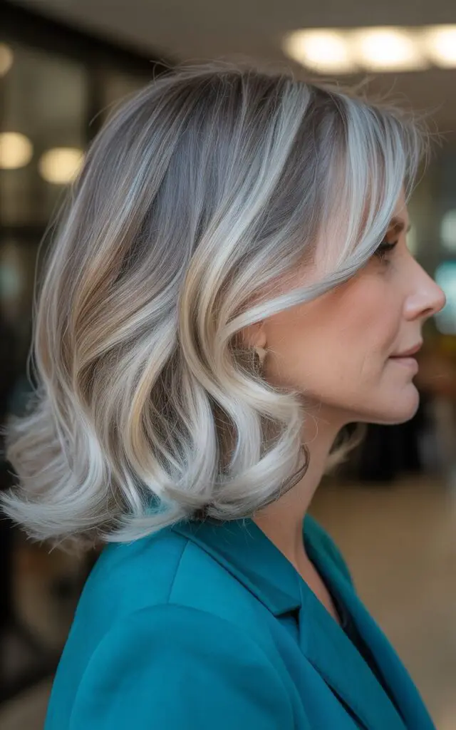 A blonde and silver blend combines traditional blonde highlights or balayage with intentional silver pieces, creating a multi-dimensional look that celebrates both color and natural gray. This technique acknowledges your transition while maintaining a polished, salon-fresh appearance. It’s particularly effective for women who want to keep some warmth but also want their gray to feel like part of the overall design.