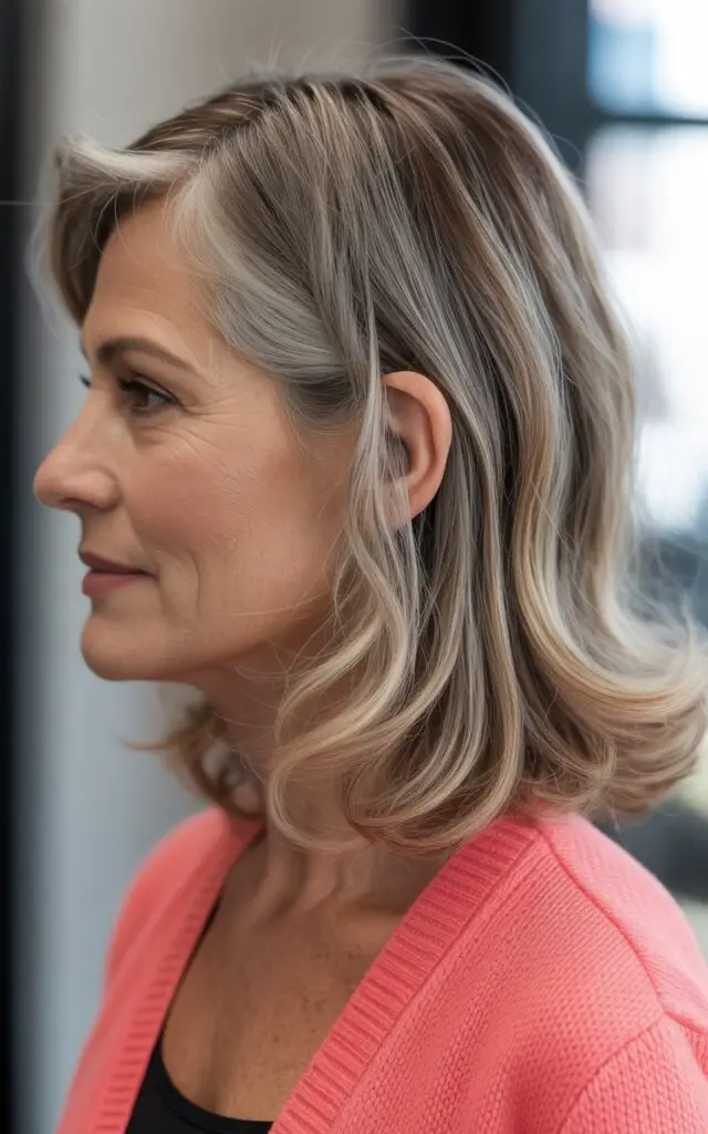 Cool-toned balayage typically incorporates ash blonde, beige, or even silver-toned highlights depending on your base color. These cooler shades harmonize with natural gray far better than warm, golden tones. The technique is also low-maintenance, requiring touch-ups only every 12-16 weeks. As you transition, your colorist can gradually reduce the amount of painted color, letting more natural gray show through.