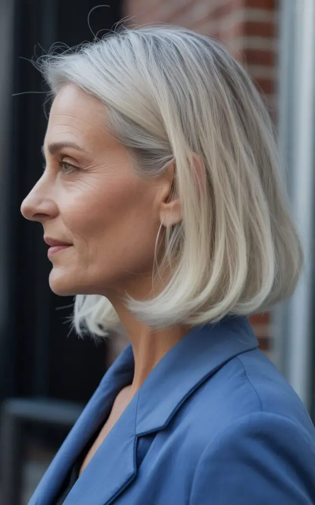 Going platinum might seem counterintuitive when transitioning to gray, but it’s actually a clever strategy for certain women. If you’re willing to lighten your entire head to a very pale blonde, your incoming gray roots will be far less noticeable against the light base. This creates a soft, almost monochromatic look that reads as intentional.