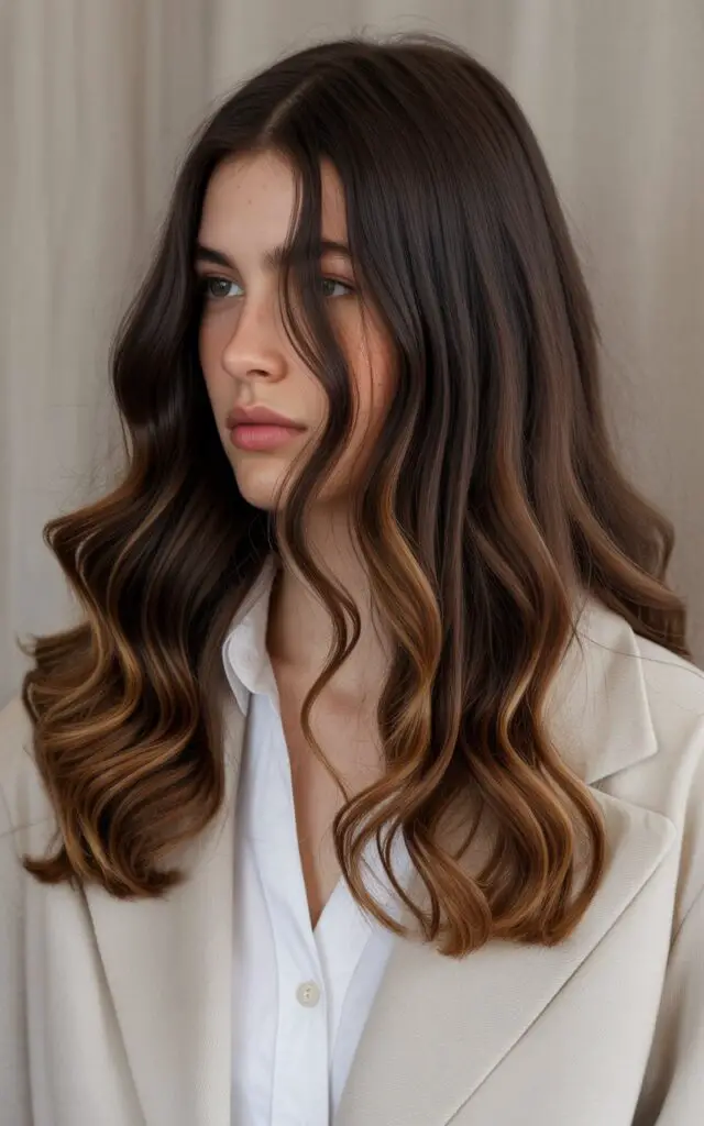 Adding caramel ribbons to your dark base creates stunning dimension. This combination has dominated salons for good reason. The contrast between dark and light tones makes your hair look thicker and more textured.