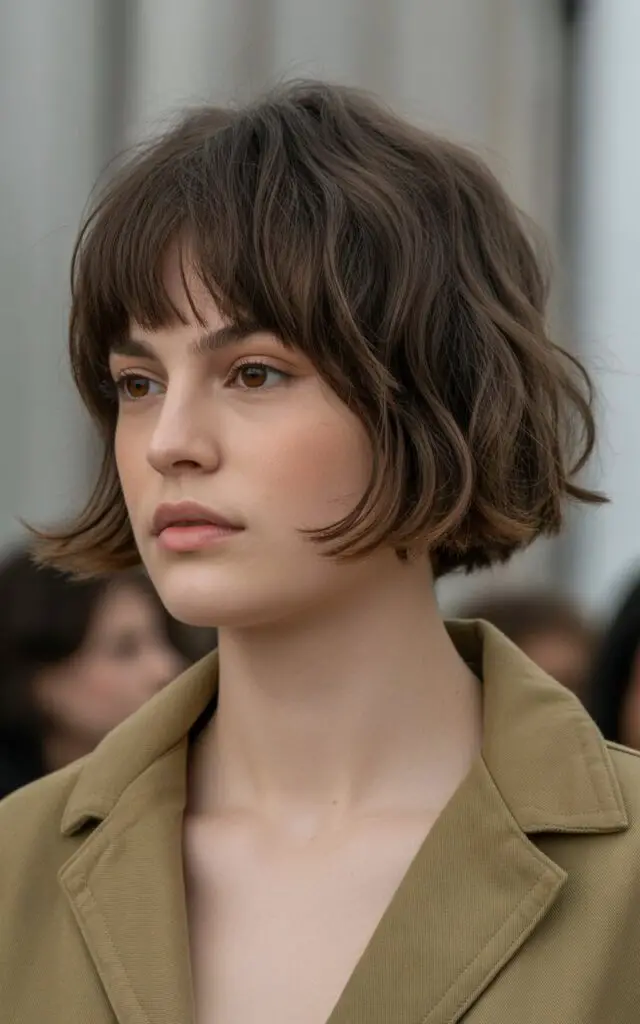 Why choose such short bangs? They create instant drama and modernity. They also provide maximum forehead coverage, which helps balance a long face shape. The combination with a shaggy bob softens the boldness somewhat, as the textured layers throughout the rest of the hair add movement and femininity.